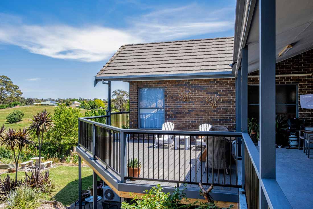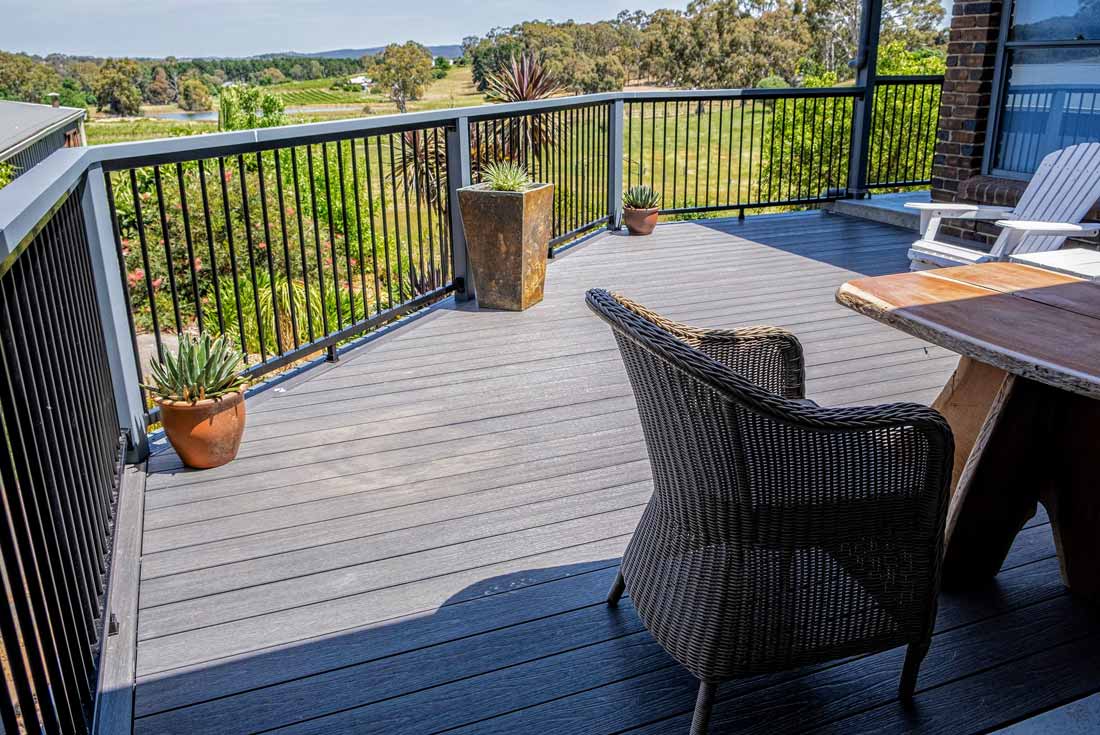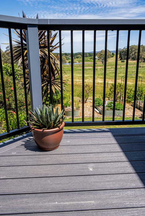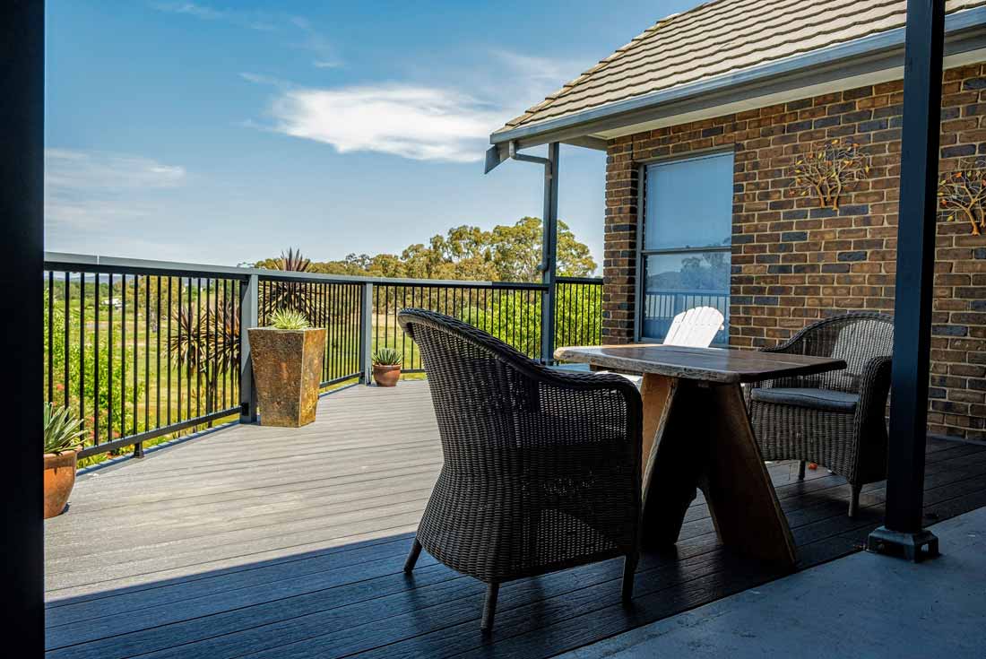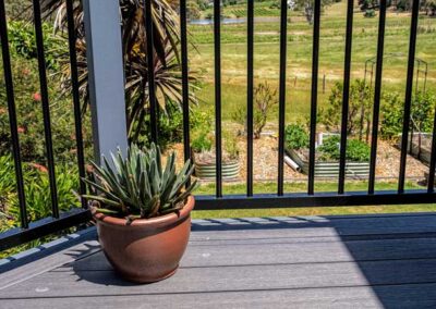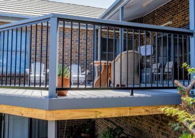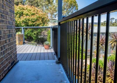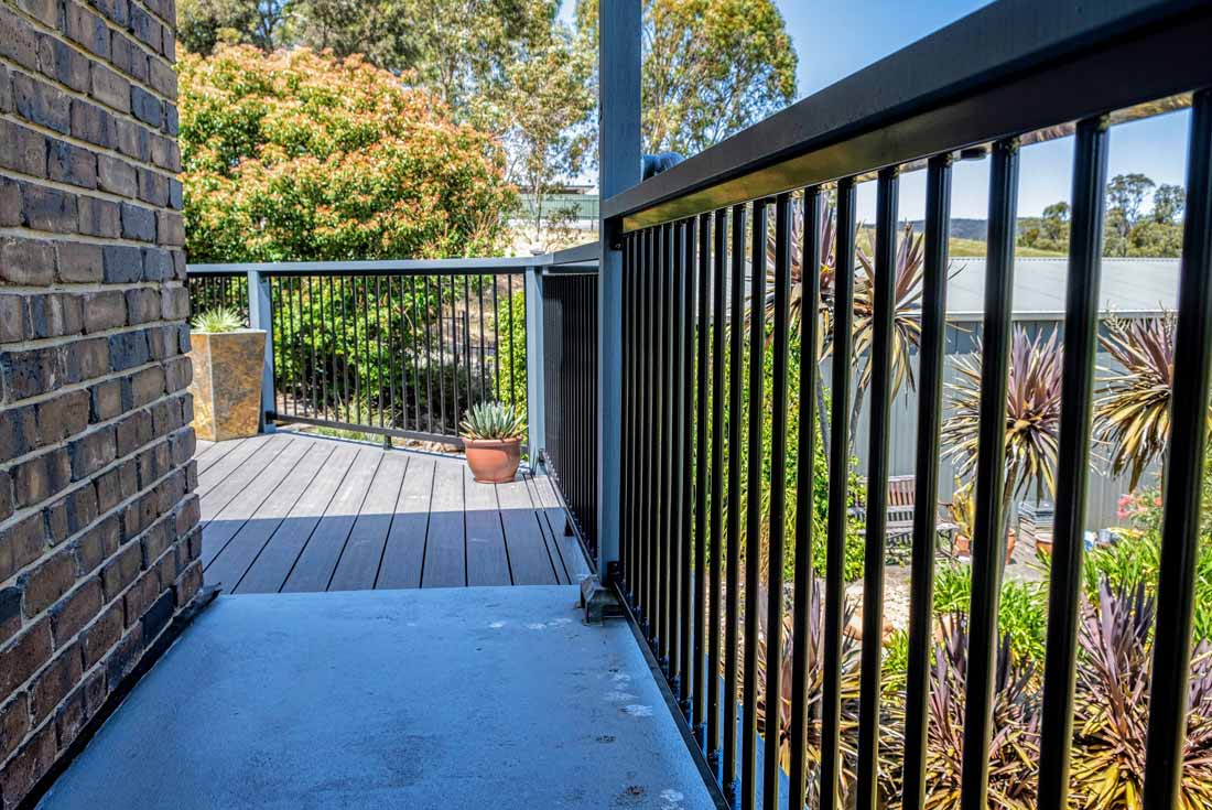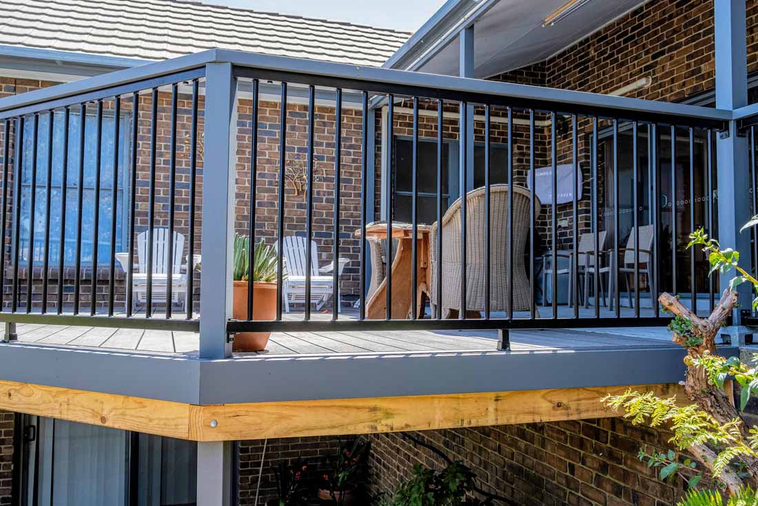 Peter chose NewTechWood for his deck as it never requires maintenance. As the new deck required handrails and Balustrades, Peter decided to replace his existing balconies handrails and balustrades to an easy maintenance option. The new handrails are painted LOSP, and the Balustrades are welded aluminium powder coated panels from Pelican Panels. The panels are custom made, and can be made in many styles.