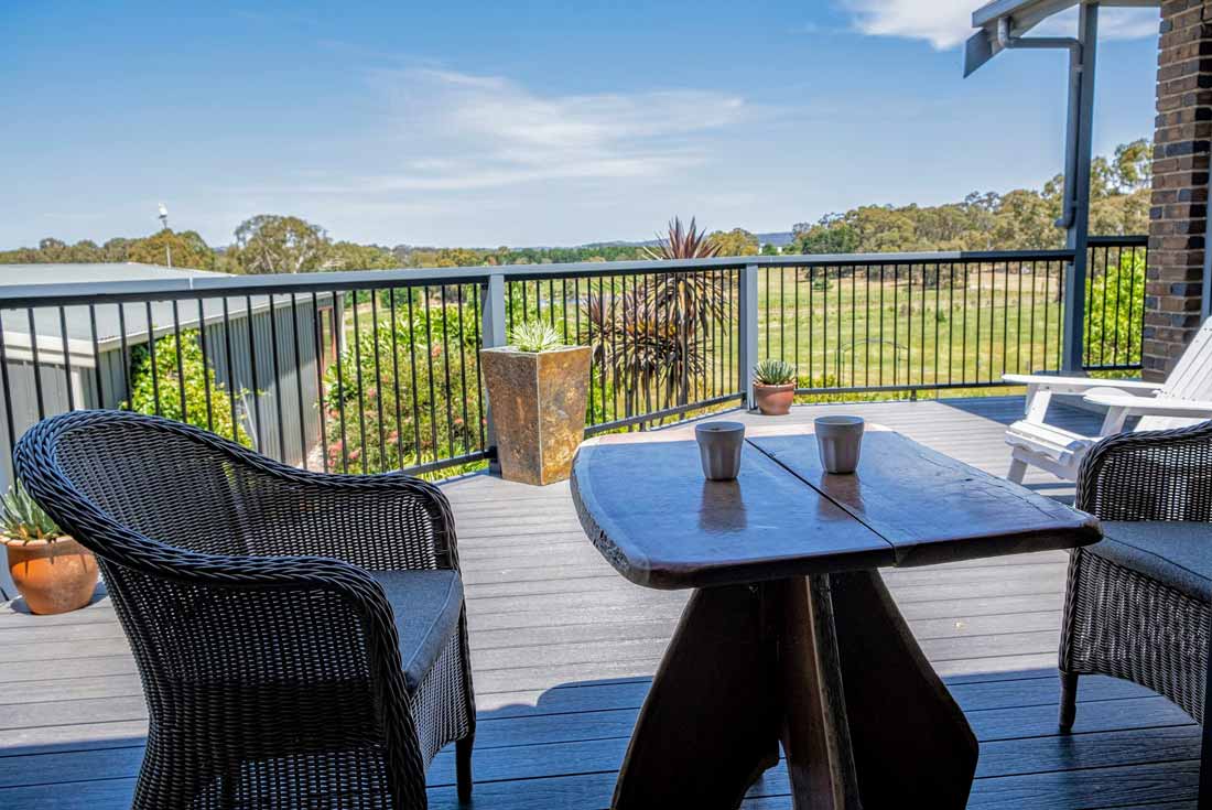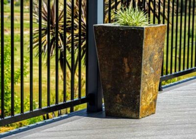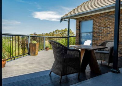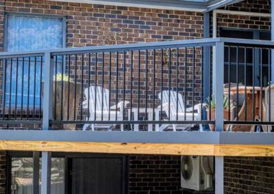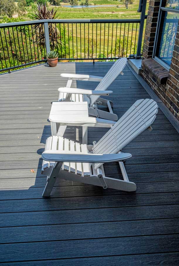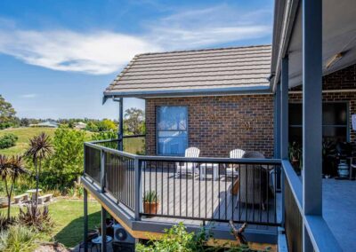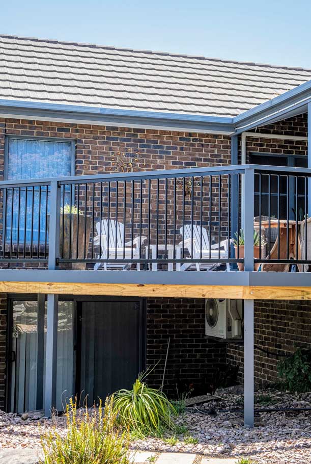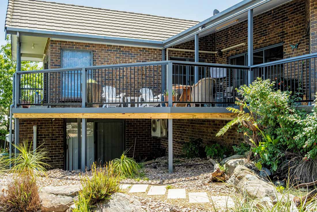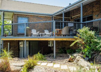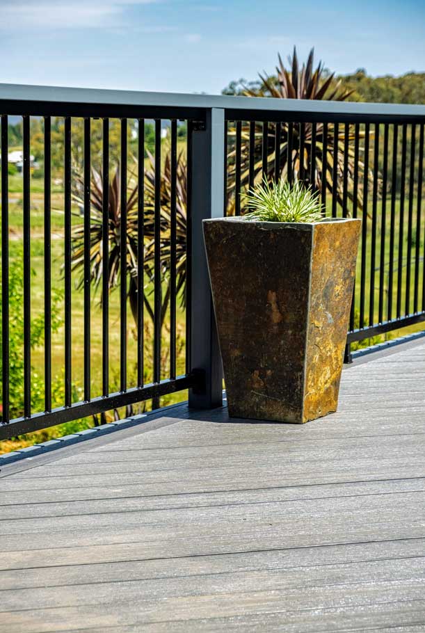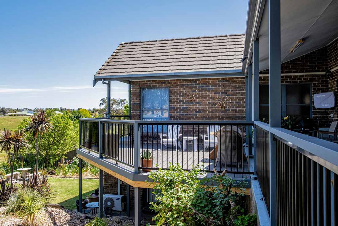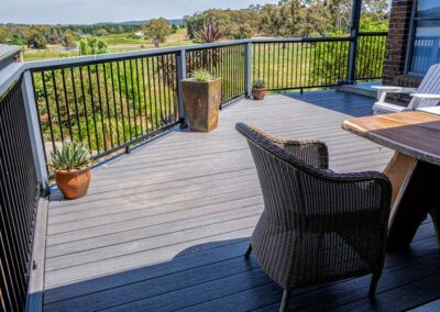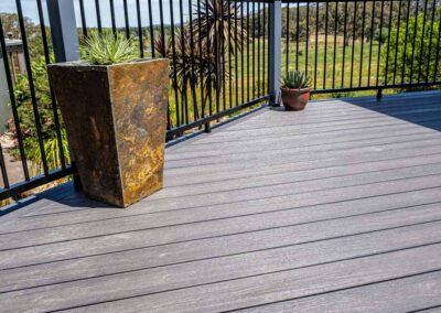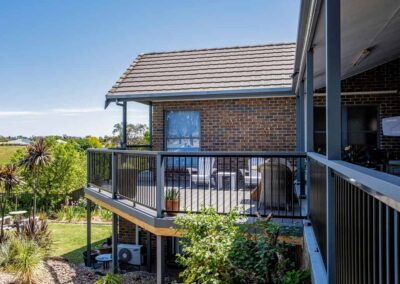 Peter chose NewTechWood for his deck as it never requires maintenance. As the new deck required handrails and Balustrades, Peter decided to replace his existing balconies handrails and balustrades to an easy maintenance option. The new handrails are painted LOSP, and the Balustrades are welded aluminium powder coated panels from Pelican Panels. The panels are custom made, and can be made in many styles.